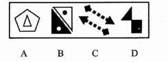 解析:本題考點為封閉性。本題所有圖形均為封閉圖形,因此也需選一個封閉圖形,故答案選D。請注意,D項的圖形雖然內部有黑有白,但是最外面一圈的框架可以封閉,即滿足封閉性;B項中的圖形只是包含了一個封閉空間,并沒有滿足圖形整體的封閉,所以不滿足封閉性;A項中的兩個圖形雖然各自封閉,但整體并不封閉,所以不滿足封閉性。