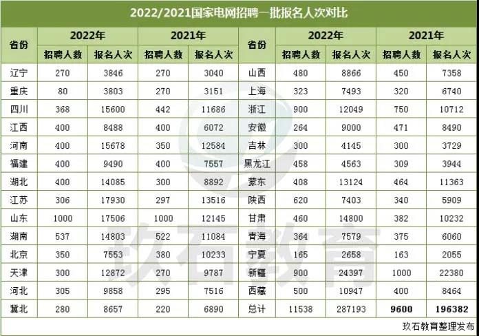 2022年國家電網招聘一批報名與12月20日結束,超過34萬人次報名。今天玖石教育玖石君匯總了2022和2021年國家電網招聘一批數據對比。有幾個問題先和考生說明一下: