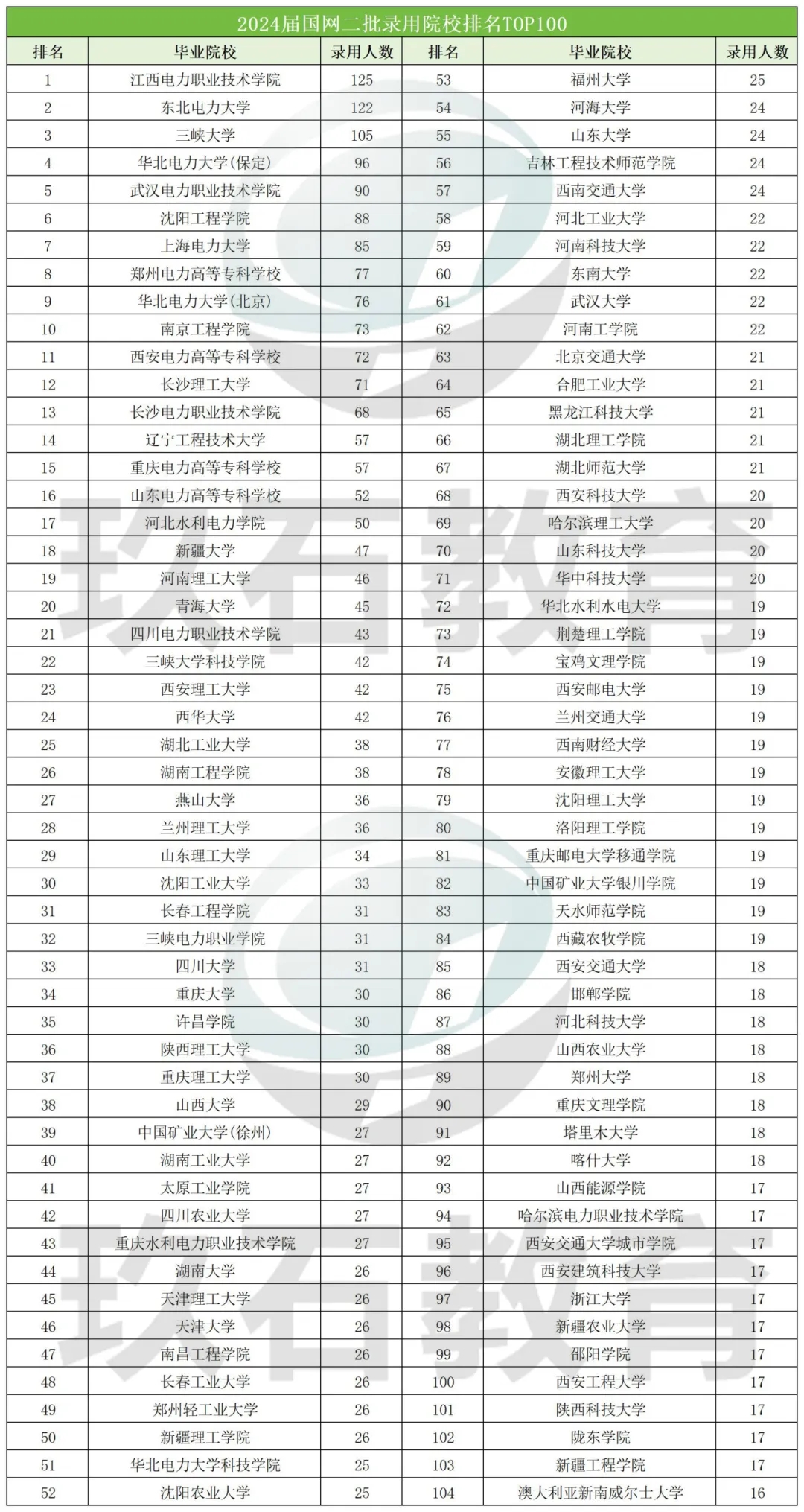 從表中數據可得,江西電力職業技術學院、東北電力大學、三峽大學排名榜單前三名,分別錄用125人、122人、105人,第四、五名是華北電力大學、武漢電力職業技術學院,分別錄用了96人、90人。