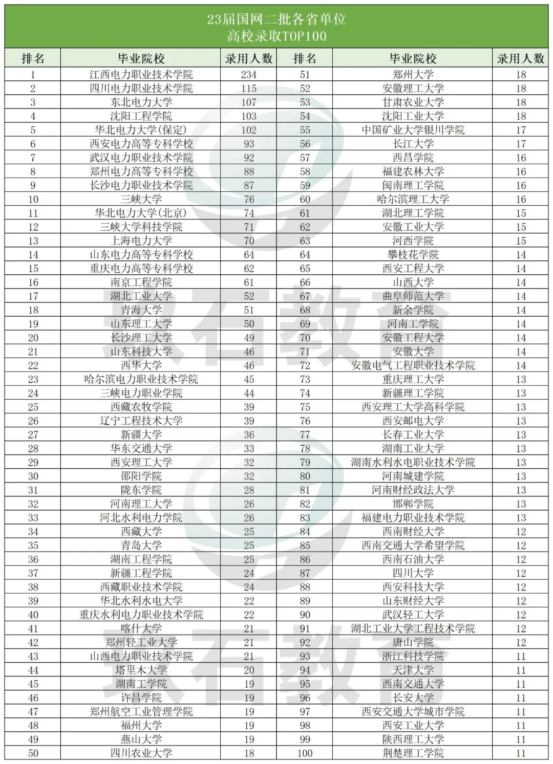 從表中數據可得,江西電力職業技術學院、四川電力職業技術學院兩所專科院校排名榜單前兩名分別錄用234人、115人,第三、四名是東北電力大學、沈陽工程學院,分別錄用了107人、103人。