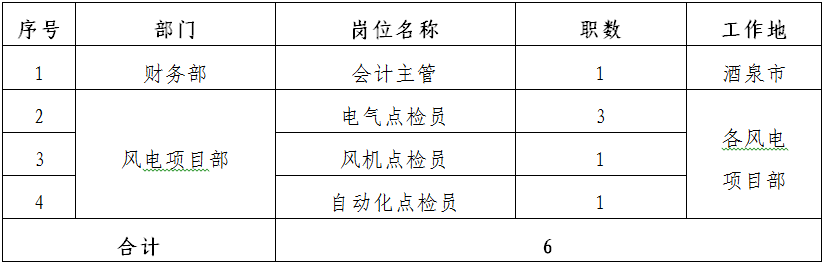 根據(jù)工作需要,面向集團公司系統(tǒng)內(nèi)公開招聘所屬酒泉風(fēng)電、瓊海環(huán)保等兩家單位工作人員?,F(xiàn)將有關(guān)事項公告如下: