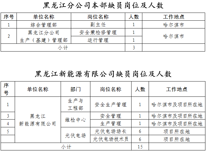 國家電投集團有限公司黑龍江分公司(以下簡稱黑龍江分公司)于2015年12月注冊成立,經過兩年多的開拓與發展,截至6月底,累計投運17個光伏項目,總裝機容量478MWp,實現了從"零資產"到"自負盈虧"的跨躍。為進一步加強黑龍江分公司及所屬單位的生產管理能力,現面向集團公司系統內公開招聘缺員崗位,具體情況如下: