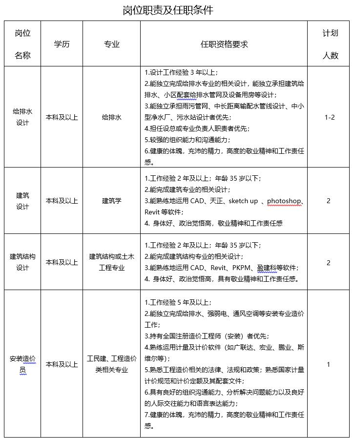 為滿足生產(chǎn)需要,經(jīng)研究決定,現(xiàn)公開招聘給排水設(shè)計(jì)人員1-2名、建筑設(shè)計(jì)人員2名、建筑結(jié)構(gòu)設(shè)計(jì)人員2名以及安裝造價(jià)員1名,崗位要求詳見下表: