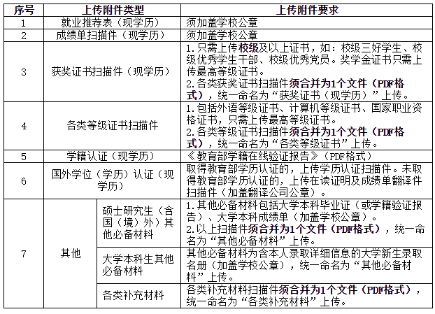 3.上傳應聘附件材料。應聘畢業生須通過招聘平臺及時、規范上傳個人應聘附件材料,應聘附件材料文檔數量一般為6個(不超過7個)。應聘畢業生應確保應聘材料能正常打開、清晰顯示,因應聘材料不能正常打開、圖像不清晰或未按規范要求填報導致的結果由應聘畢業生本人承擔。上傳附件具體要求如下: