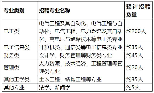 1.第二批招收電工類,計算機、通信等電子信息類,財務類,人力資源、技術經濟、工程管理等管理類,土木工程、法學等專業的優秀應屆畢業生。以上專業均指主修專業,應與學籍認證報告中專業名稱相一致。應屆畢業生應于公司規定的入職報到時間前取得相應學歷證、學位證及報到證等相關證件。
