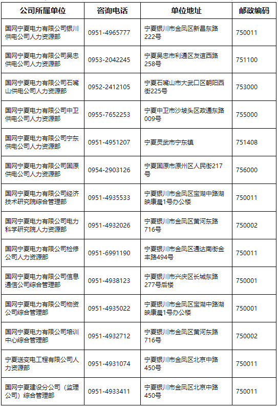 國網寧夏電力有限公司所屬各單位招聘咨詢電話及地址