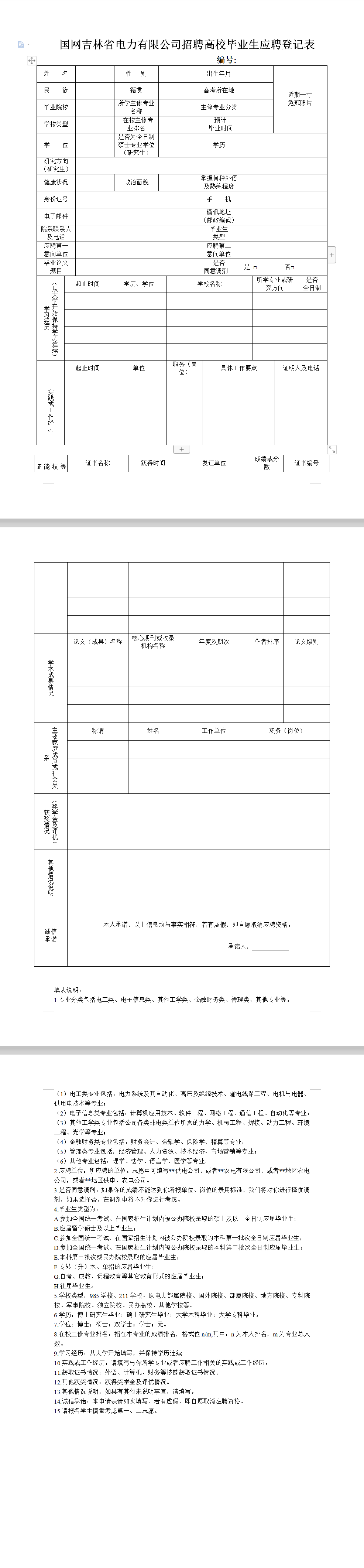 附件:國網吉林省電力有限公司招聘高校畢業(yè)生應聘登記表