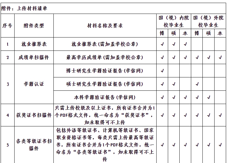 (學信網)、加蓋學校公章的就業推薦表和成績單等;本科生還需上傳含本人詳細錄取信息的本科錄取新生名冊掃描件(加蓋學校公章);研究生還需