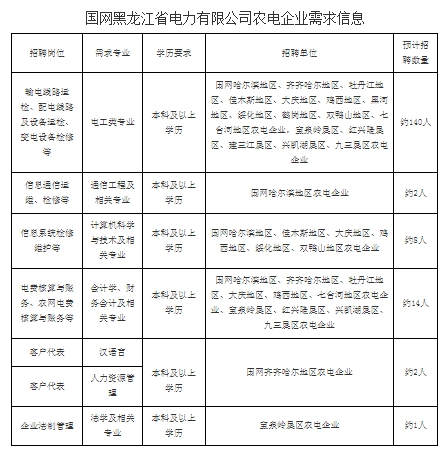 請各位考生參照需求信息選擇意向單位,公司所屬農電企業按照所屬地區進行招聘,錄用后進行二次分配,應聘畢業生填報志愿只需選擇志愿單位地區(如:齊齊哈爾地區農電企業、建三江墾區農電企業等)。