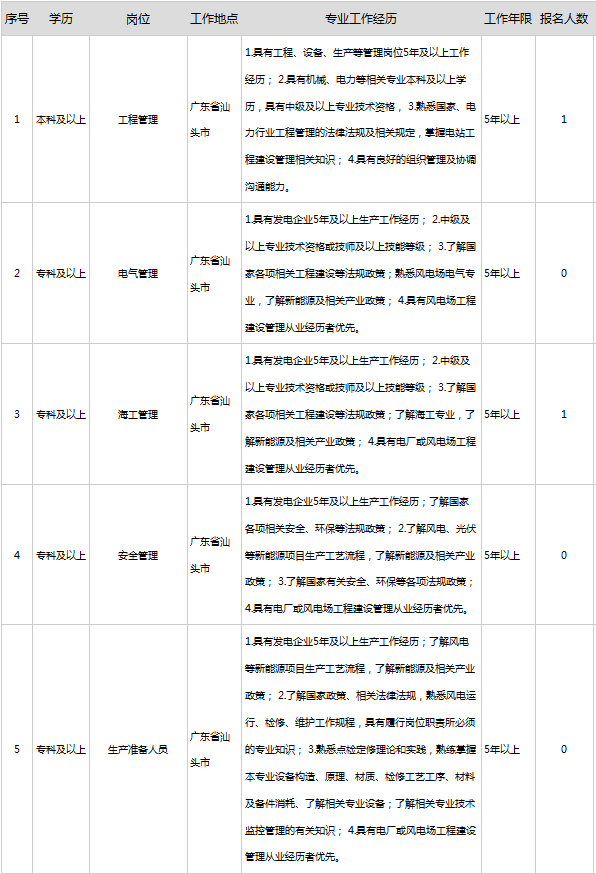 具體招聘崗位及應(yīng)聘條件詳見(jiàn)《大唐汕頭新能源有限公司招聘信息表》(附件1)。