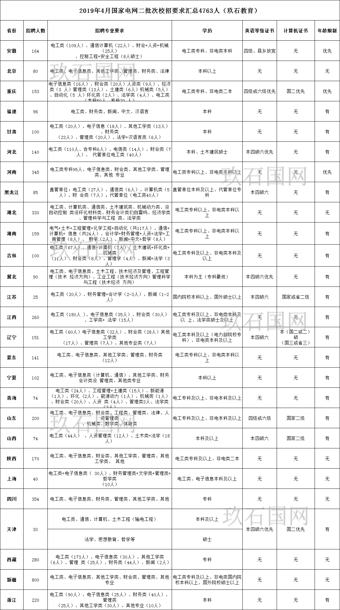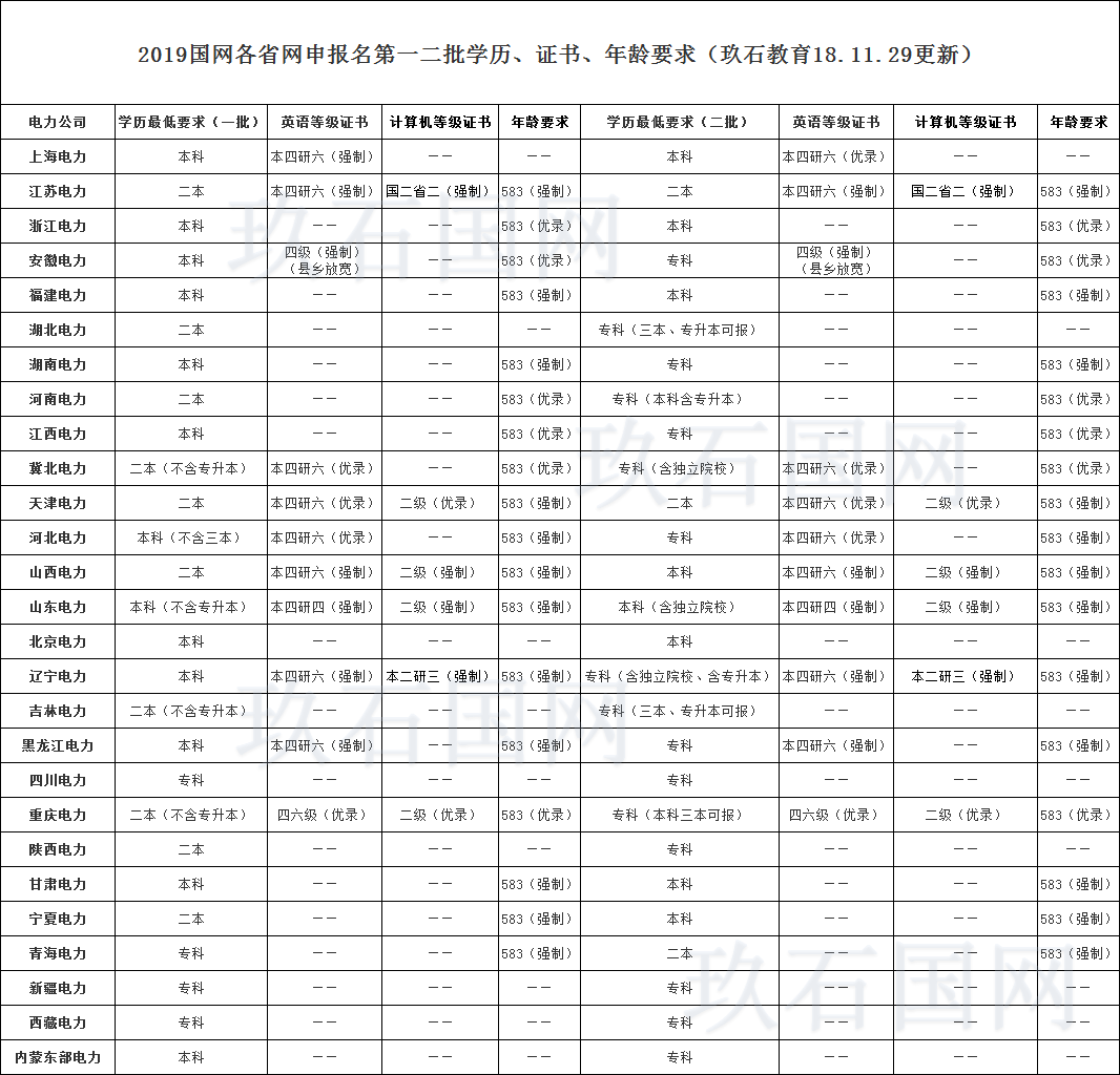 2019國家電網招聘考試將于2018年12月9日舉行;玖石教育現將2018年國家電網招聘考試第一批及第二批招聘公告上關于學歷及證書等相關要求總結發布如下: